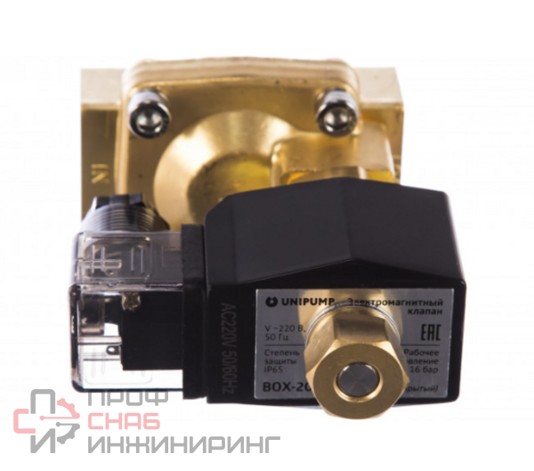 Клапан электромагнитный BOX-32 (нормально открытый) Unipump 85017 предназначен для автоматического открывания потока жидкости в трубопроводе. Состоит из латунного и пластикового корпусов. Внутри пластикового корпуса располагаются соленоид с сердечником. Сердечник свободно движется в герметично закрытой трубке. Внутри латунного корпуса расположена мембрана, которая перекрывает поток жидкости при движении магнитного сердечника.