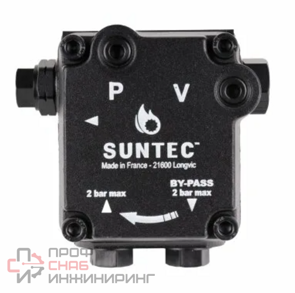Насос для горелки Suntec AN 57 D K 1303 6P позволяет перекачивать дизельное топливо и керосин со скоростью 55 и 44 л/ч (при давлении 11 бар и вязкости 5 сСт / 1,8 сСт). Обеспечивает стабильную подачу топлива на горелку под заданным давлением в пределах 7-15 бар. Давление в линии всасывания и обратного слива не должно превышать 2 бар. Особенность этой серии – встроенный регулирующий давление клапан с функцией запирания. С завода насос поставляется для 2-трубной системы и может модернизироваться под однотрубную установку.