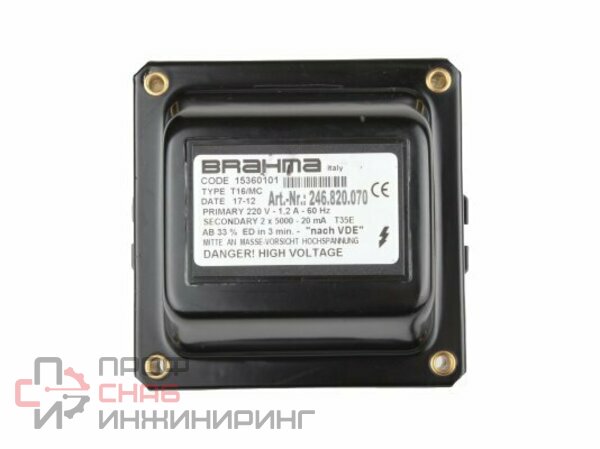 Трансформатор розжига Brahma T16 служит для оснащения горелок высокой тепловой мощности, потребляющих легкое и тяжелое топливо. Обеспечивает преобразование входящего сетевого тока 220 В в ток высокого напряжения и поджига топлива высоковольтной электрической дугой. В конструкции использованы две первичные и две вторичные обмотки. Обеспечена высокоэффективная изоляция высокого напряжения полиэфирной смолой. Корпус произведен из прессованного металла, окрашен стойкой эмалью. Уровень электрозащиты соответствует стандарту IP 00.