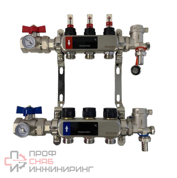 Коллекторный блок из нержавеющей стали служит для распределения потоков по контурам теплого пола, радиаторного отопления, прочих климатических систем, где в качестве теплоносителя используется вода либо незамерзающие растворы гликоля с максимальной рабочей температурой 90 °С, рабочим давлением до 9 бар.