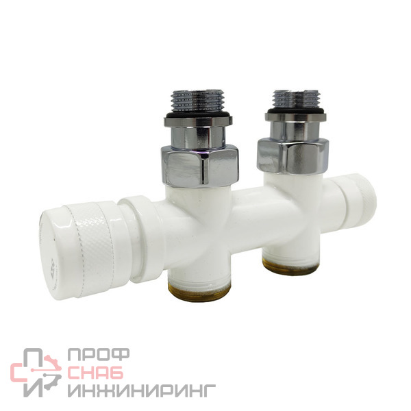 Узел SR Rubinetterie прямой для нижнего подключения радиаторов: вентиль на подачу ручной регулировки, преобразуемый в термостатический, с механизмом предварительной настройки, запорный клапан. Межосевое расстояние 50 мм, соединение для медных или многослойных труб.
