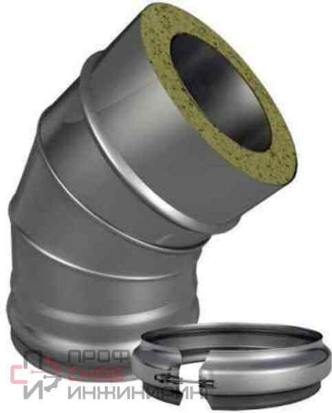 Отводы сэндвич-дымохода 45 градусов изготавливаются из цилиндрических секций, соединенных шовной сваркой. Сэндвич-отводы 45° состоят из трех сегментов. Такое количество секций необходимо для увеличения, согласно нормативам, радиуса поворота дымохода до значения диаметра дымовой трубы. При меньшем радиусе углов поток дымовых газов встречает препятствие в виде стенки дымохода и замедляется, что может приводить к перебоям в работе котла и задымлению помещения.