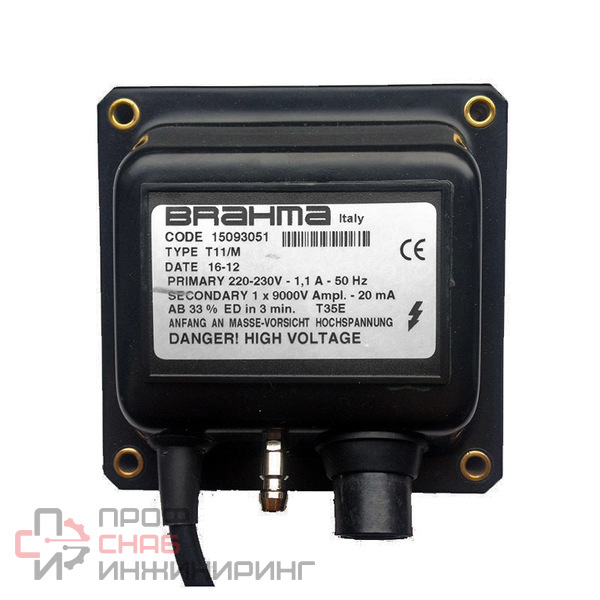 Трансформатор розжига Brahma T11/M собран в малогабаритном металлическом корпусе. Предназначен для выработки и подачи на электрод розжига высоковольтного напряжения 9 кВ. Конструкция произведена с учетом условий эксплуатации и принимаемых нагрузок.