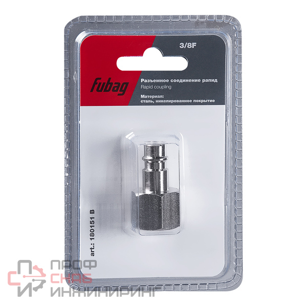 Переходник FUBAG 180151 B применяется для соединения различных частей пневмосистем. С одной стороны фитинг имеет внутреннюю резьбу — 3/8", с другой быстросъемное соединение — рапид папа. Созданная конструкция обладает высокой надежностью и герметичностью. Поставляется в блистере.