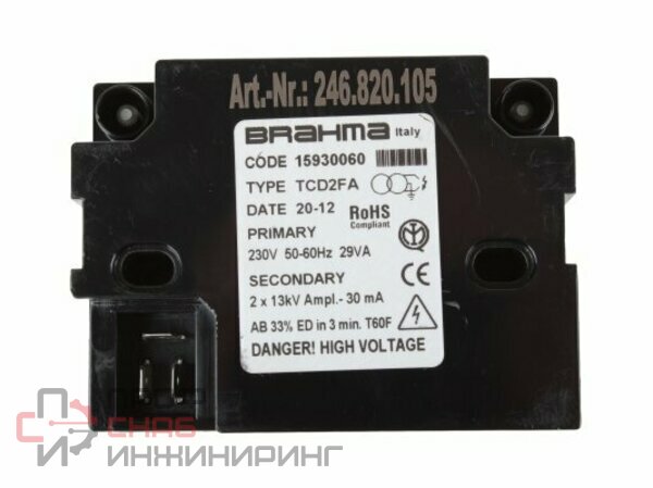 Трансформатор розжига Brahma TCD2FA встраивается в бытовые и промышленные горелки для выработки высоковольтного напряжения 13 кВ и подачи на запальные электроды. Компактные размеры конструкции позволяют экономить рабочее пространство и подходят на замену большинства трансформаторов других производителей. Преимуществом является встроенный противопомеховый фильтр.