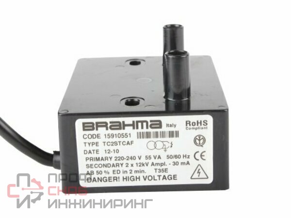 Трансформатор розжига Brahma TC2STCAF служит для получения высоковольтной поджигающей искры за счет повышения напряжения в высокое напряжение. Применяется для оснащения газовых и жидкотопливных горелок, тепловых пушек, подходит для бытовых и промышленных систем.