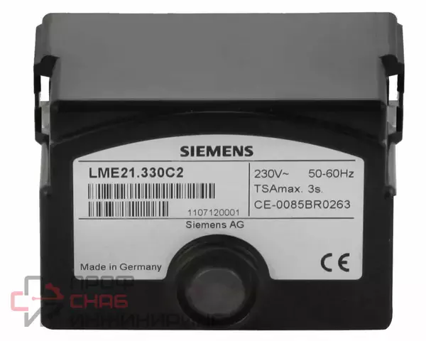 Топочный автомат Siemens LME21.130C2 предназначен для оснащения наддувных газовых и комбинированных горелок с двумя ступенями регулирования мощности. Отвечает за безопасный розжиг, непрерывный контроль пламени совместно с датчиком, эффективное горение, защитное отключение при сбоях.