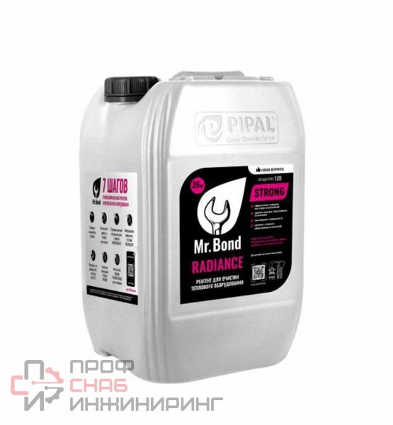 Mr.Bond Radiance – высококонцентрированное средство для очистки внутренних и наружных поверхностей пластинчатых теплообменников, котлов, бойлеров, конденсаторов и другого теплообменного оборудования от минеральных отложений (ржавчины, накипи, солей, оксидов и др.). Входящие в состав реагента присадки препятствует возникновению центров кристаллизации солей жёсткости и образованию осадков в виде накипи и шлама. Разрешено применение с металлами: нержавеющая сталь, сталь, медь. Применим как для безразборного, так и для разборного метода промывки, при соблюдении норм безопасности. Применяется на предприятиях энергетики, теплоснабжения, коммунального хозяйства, водоснабжения, в системах отопления и водоснабжения подвижного состава.