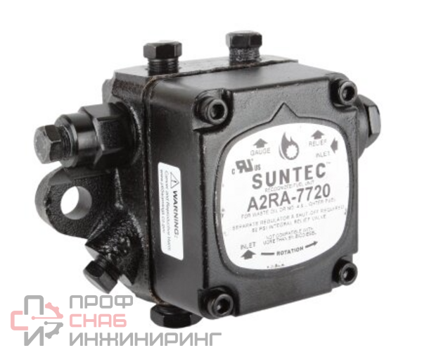 Универсальный жидкотопливный насос Suntec A2 RA 7720 – компактное оборудование невысокой производительности для установки в горелки малой мощности. Скорость подачи топлива составляет 9,5 л/час при базовом значении давления (7 атм.). Особенностью является встроенный регулировочный клапан, выполняющий запорную функцию.