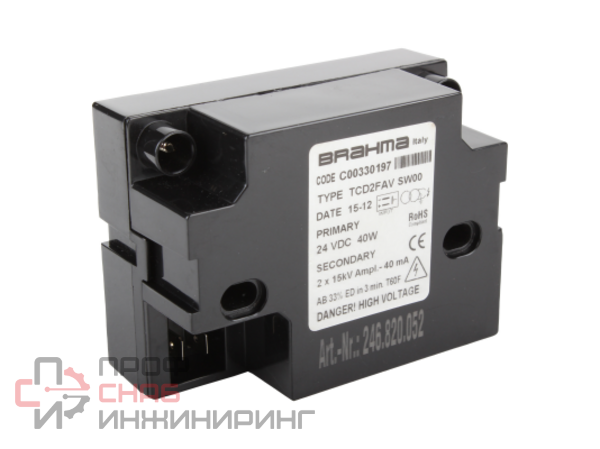 Трансформатор розжига Brahma TCD1FAV 15930023 для газовых и жидкотопливных горелок любого назначения. Повышает входящий ток 24 В до высоковольтного 22 кВ, необходимого для мощного искрового поджига. Предусмотрена надежная изоляция высокого напряжения и противопомеховый фильтр.
