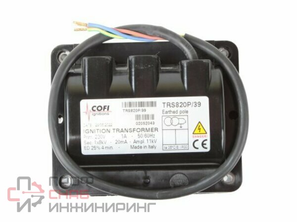 Трансформатор поджига Cofi TRS820P/39 применяется для преобразования входящего тока в ток высокого напряжения, необходимый для поджига топливной смеси при включении горелки.