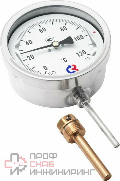 БТ-52.211 (0...100С) M20x1,5.120.1,5. Радиальное присоединение в комплекте с защитной латунной гильзой. Термометр радиальный биметаллический предназначен для измерения температуры жидкостей, пара и газов в отопительных и санитарных установках, в системах кондиционирования и вентиляции. Принцип действия термометра основан на зависимости деформации чувствительного элемента от измеряемой температуры. В качестве чувствительного элемента используется биметаллическая пружина. Биметаллическая пружина изготавливается из двух прочно соединенных металлических пластин, имеющих различные температурные коэффициенты линейного расширения. При изменении температуры пружина изгибается и вращает стрелку термометра. Один конец пружины закреплен внутри штока, а к другому присоединяется ось стрелки. Корпус термометра изготавливается из коррозионностойкой стали, шток — из нержавеющей стали.