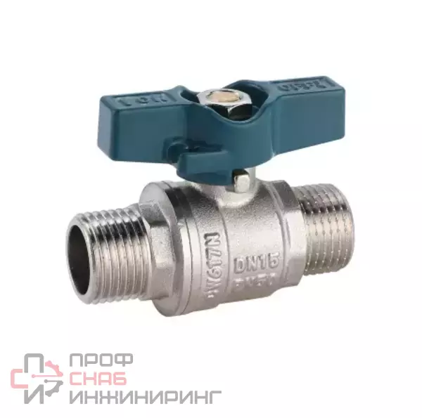 Кран шаровой. Вид: прямой кран. Назначение: вода. Тип ручки: бабочка. Тип арматуры: запорная. Материал: корпус- латунь, шарик-латунь. Тип резьбы: 3/4М-3/4М (3/4 штуцер-штуцер). Тип присоединения: резьбовой