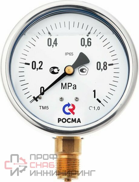 Манометр Росма ТМ-520Р.00(0-40MPa)G1/2.1,0. Промышленный манометр в корпусе из нержавеющей стали с возможностью гидрозаполнения (виброустойчивый). Применяется для измерения давления неагрессивных к медным сплавам жидких и газообразных, не вязких и не кристаллизующихся измеряемых сред с температурой до 150 °C. Этот тип манометра может использоваться в условиях повышенной вибрации и при измерении переменного давления. Повышенная устойчивость к воздействию окружающей среды — степень защиты прибора IP65.При измерении давления с высокими динамическими нагрузками прибор необходимо заполнить глицерином или силиконом