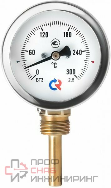 БТ-32.211(0-100С)G1/2.46.2,5. Радиальное присоединение в комплекте с защитной латунной гильзой. Термометр радиальный биметаллический предназначен для измерения температуры жидкостей, пара и газов в отопительных и санитарных установках, в системах кондиционирования и вентиляции. Принцип действия термометра основан на зависимости деформации чувствительного элемента от измеряемой температуры. В качестве чувствительного элемента используется биметаллическая пружина. Биметаллическая пружина изготавливается из двух прочно соединенных металлических пластин, имеющих различные температурные коэффициенты линейного расширения. При изменении температуры пружина изгибается и вращает стрелку термометра. Один конец пружины закреплен внутри штока, а к другому присоединяется ось стрелки. Корпус термометра изготавливается из коррозионностойкой стали, шток — из нержавеющей стали.