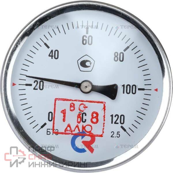 Тип БТ, серия 211. Термометр осевой биметаллический предназначен для измерения температуры жидкостей, пара и газов в отопительных и санитарных установках, в системах кондиционирования и вентиляции. Принцип действия термометров БТ основан на зависимости деформации чувствительного элемента от измеряемой температуры. В качестве чувствительного элемента используется биметаллическая пружина. Биметаллическая пружина изготавливается из двух прочно соединенных металлических пластин, имеющих различные температурные коэффициенты линейного расширения. При изменении температуры пружина изгибается и вращает стрелку термометра. Один конец пружины закреплен внутри штока, а к другому присоединяется ось стрелки.Корпус термометра изготавливается из коррозионностойкой стали, шток — из нержавеющей стали, при температуре 0...+450 °С и длине погружной части 100 мм и более, материал гильзы — нержавеющая сталь.Область применения: системы кондиционирования, теплоснабжение, водоснабжение.