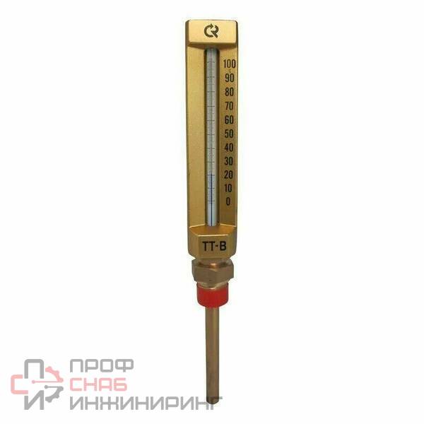 Тип ТТ-В. Термометр технический жидкостный предназначен для измерения температуры неагрессивных жидких и газообразных сред в пределах от −30 до +200 °С. Приборы могут использоваться в условиях высоких динамических нагрузок в различных отраслях промышленности.Приборы состоят из защищенной стеклянной оболочкой капиллярной трубки с резервуаром, заполненным термометрической жидкостью, защитного корпуса и защитной гильзы. Шкала термометра нанесена на наружной поверхности капиллярной трубки. Верхняя часть капилляра (со шкалой) находится в корпусе, а нижняя (с резервуаром) — в гильзе.Корпус изготовлен из анодированного алюминия. Гильза изготавливается либо из латуни, либо из нержавеющей стали. По типу присоединения прибор может быть изготовлен в двух вариантах исполнения: термометр технический прямой и угловой.Область применения: судостроение, водоснабжение, теплоснабжение.