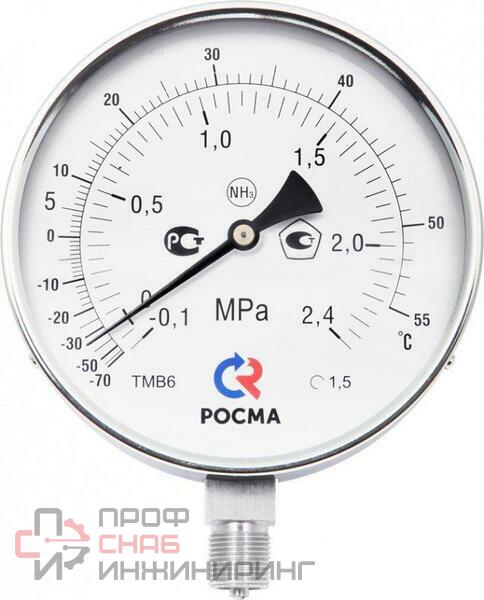 ТМВ-611Р.00 (-0,1-1,5 МПа)(-70…+40С)М20х1,5 1,5 NH3. Мановакуумметр аммиачный предназначен для измерения избыточного и вакуумметрического давления жидкого, газообразного и водного раствора аммиака.Прибор имеет дополнительную температурную шкалу.Область применения: нефтехимическая промышленность, пищевая промышленность, химическая промышленность.