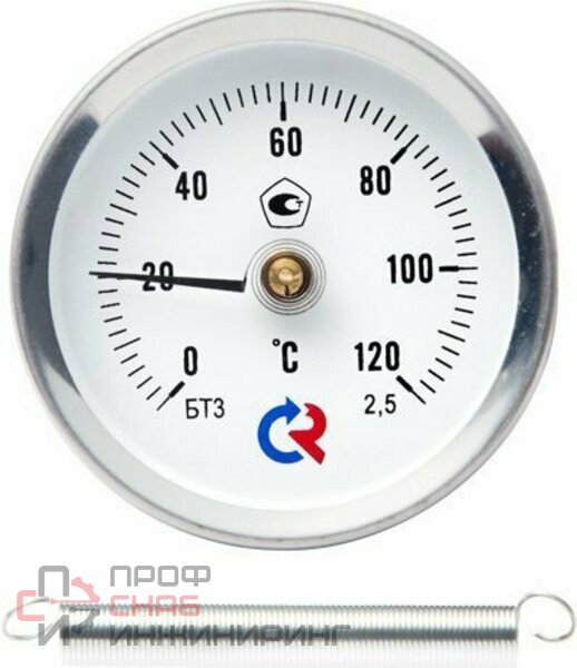 БТ-30.010 (0-100С) 2,5. Термометр биметаллический накладной с пружиной предназначен для измерения температуры приповерхностного слоя среды (вязкой, жидкой, газообразной) цилиндрических объектов, например трубы в системе отопления. Принцип действия прибора основан на зависимости деформации чувствительного элемента от измеряемой температуры. В качестве чувствительного элемента используется биметаллическая пружина, которая изготавливается из двух прочно соединенных металлических пластин, имеющих различные температурные коэффициенты линейного расширения. При изменении температуры пружина изгибается и вращает стрелку термометра (биметаллическая пружина навита вокруг оси контактного элемента, а стрелка закреплена непосредственно на биметалле).