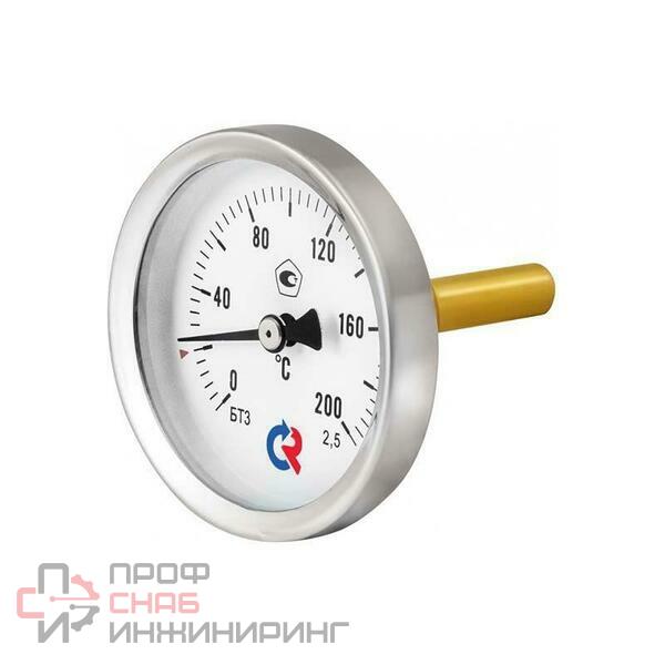 Тип БТ, серия 211. Термометр биметаллический (осевое присоединение) в комплекте с защитной латунной* погружной гильзой. Прибор предназначен для измерения температуры жидкостей, пара и газов в отопительных и санитарных установках, в системах кондиционирования и вентиляции. Принцип действия прибора основан на зависимости деформации чувствительного элемента от измеряемой температуры. В качестве чувствительного элемента используется биметаллическая пружина. Она изготавливается из двух прочно соединенных металлических пластин, имеющих различные температурные коэффициенты линейного расширения. При изменении температуры пружина изгибается и вращает стрелку термометра. Один её конец закреплен внутри штока, а к другому присоединяется ось стрелки. Корпус прибора изготавливается из коррозионностойкой стали, шток — из нержавеющей стали.Область применения: системы кондиционирования, теплоснабжения, водоснабжения.