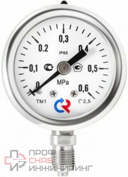 Манометр коррозионностойкий выполнен полностью из нержавеющей стали. Применяется для измерения давления агрессивных жидких и газообразных, не вязких и не кристаллизующихся измеряемых сред с температурой до 200 °C. Эти промышленные манометры могут использоваться в условиях агрессивной окружающей среды, повышенной вибрации и при измерении переменного давления. Повышенная устойчивость к воздействию окружающей среды — степень защиты приборов IP65. Может использоваться в сборе с разделителем сред. При измерении давления с высокими динамическими нагрузками, прибор необходимо заполнить глицерином или силиконом.