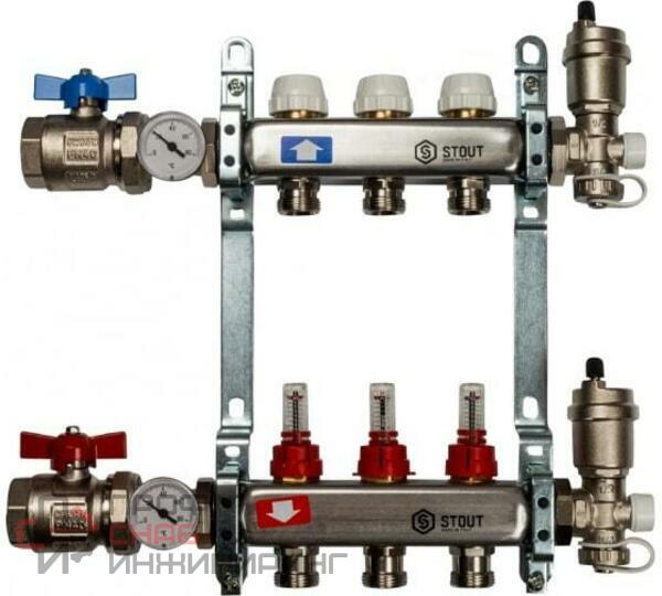 Коллектор из нержавеющей стали в сборе с расходомерами STOUT 3 выхода SMS 0907 000003 предназначен для оснащения теплоносителем системы водяного отопления или теплого пола в многоквартирных домах или зданиях индивидуальной постройки. Изделие способно направлять теплоноситель на три узла, перекрывать полностью подачу воды, регулировать и измерять ее расход.