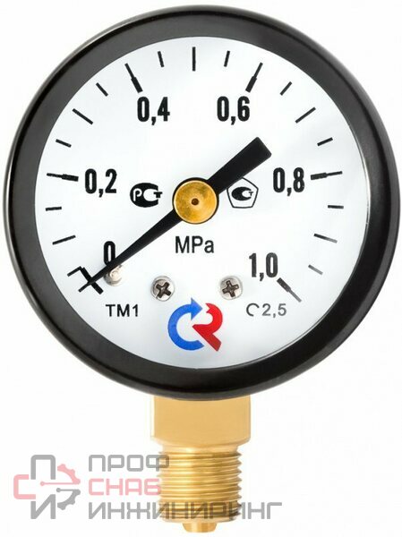 ТМ-110Р.00 0-4 МПа G1/8 2,5. Манометр стандартный используется для измерения избыточного, вакуумметрического или мановакуумметрического давления неагрессивных к медным сплавам жидких и газообразных, не вязких и не кристаллизующихся сред с температурой до 150 °C. Корпус манометров в стандартном исполнении выполнен из стали, механизм — из латунного сплава. Принцип действия манометров основан на зависимости деформации чувствительного элемента от измеряемого давления. В качестве чувствительного элемента используется трубка Бурдона. Под воздействием измеряемого давления свободный конец трубки перемещается и с помощью специального механизма и вращает стрелку манометра.