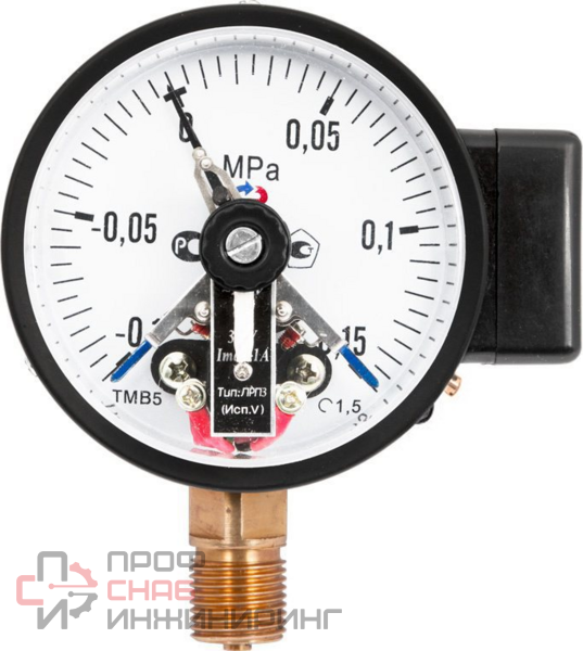 Мановакуумметр с электроконтактной приставкой, более известный в обиходе как электроконтактный мановакуумметр или ЭКМ, предназначен для коммутации электрических цепей в зависимости от величины измеряемого давления.ЭКМ работает следующим образом: электроконтактная группа и стрелка прибора механически связаны и при переходе стрелки за значение уставки (пороговое значение) происходит замыкание или размыкание электрической цепи.