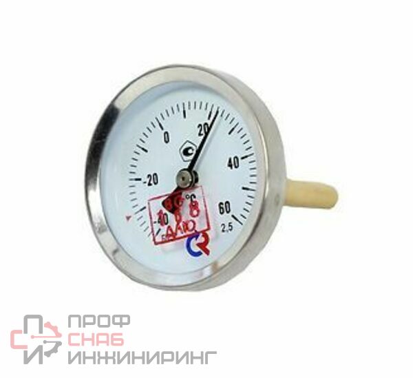 Тип БТ, серия 211. Термометр осевой биметаллический предназначен для измерения температуры жидкостей, пара и газов в отопительных и санитарных установках, в системах кондиционирования и вентиляции. Принцип действия термометров БТ основан на зависимости деформации чувствительного элемента от измеряемой температуры. В качестве чувствительного элемента используется биметаллическая пружина. Биметаллическая пружина изготавливается из двух прочно соединенных металлических пластин, имеющих различные температурные коэффициенты линейного расширения. При изменении температуры пружина изгибается и вращает стрелку термометра. Один конец пружины закреплен внутри штока, а к другому присоединяется ось стрелки.Корпус термометра изготавливается из коррозионностойкой стали, шток — из нержавеющей стали, при температуре 0...+450 °С и длине погружной части 100 мм и более, материал гильзы — нержавеющая сталь.Область применения: системы кондиционирования, теплоснабжение, водоснабжение.