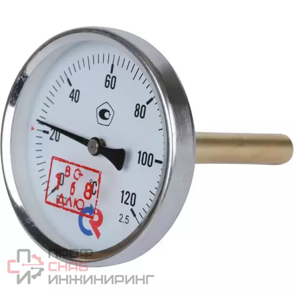 Тип БТ, серия 211. Термометр осевой биметаллический предназначен для измерения температуры жидкостей, пара и газов в отопительных и санитарных установках, в системах кондиционирования и вентиляции. Принцип действия термометров БТ основан на зависимости деформации чувствительного элемента от измеряемой температуры. В качестве чувствительного элемента используется биметаллическая пружина. Биметаллическая пружина изготавливается из двух прочно соединенных металлических пластин, имеющих различные температурные коэффициенты линейного расширения. При изменении температуры пружина изгибается и вращает стрелку термометра. Один конец пружины закреплен внутри штока, а к другому присоединяется ось стрелки.Корпус термометра изготавливается из коррозионностойкой стали, шток — из нержавеющей стали, при температуре 0...+450 °С и длине погружной части 100 мм и более, материал гильзы — нержавеющая сталь.Область применения: системы кондиционирования, теплоснабжение, водоснабжение.
