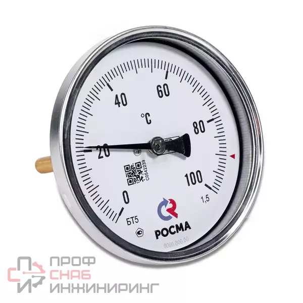Тип БТ, серия 211. Радиальное присоединение в комплекте с защитной латунной гильзой. Термометр радиальный биметаллический предназначен для измерения температуры жидкостей, пара и газов в отопительных и санитарных установках, в системах кондиционирования и вентиляции. Принцип действия прибора основан на зависимости деформации чувствительного элемента от измеряемого значения, °C. В качестве чувствительного элемента используется биметаллическая пружина. Она изготавливается из двух прочно соединенных металлических пластин, имеющих различные температурные коэффициенты линейного расширения. При изменении температуры пружина изгибается и вращает стрелку термометра. Один конец пружины закреплен внутри штока, а к другому присоединяется ось стрелки. Корпус прибора изготавливается из коррозионностойкой стали, шток — из нержавеющей стали.