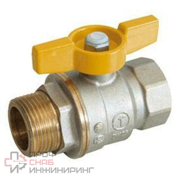 Кран шаровой полнопроходной, резьба внутренняя/наружная, никелированный, для газа, ручка - бабочка желтая.