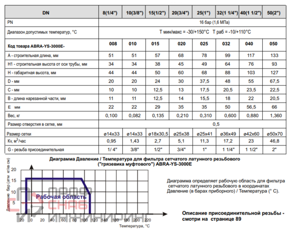 Рабочие среды и применения: механическая очистка рабочей среды от грязи, ржавчины, стружки и т. д., в системах отопления, тепло-водоснабжения и системах кондиционирования. Также данную конструкцию можно использовать на воздух, азот, масла, углекислый, природный (натуральный) газ и другие нейтральные жидкости и газы. Корпус и крышка: Латунь Н57 по GB (не менее 57% меди, (примерно как Лмц 58-2)). Прокладка крышки (2): PTFE (Фторопласт-4, Ф-4) Сетка (1): Нержавеющая сталь SS 304 = AISI 304 = JIS SUS304 = W.-nr.1.4350 = DIN X5CrNi189 = BS 304S11 = EN 58E = AFNOR Z6CN18.09 = UNI X5CrNi1810 = UNE F.3551 = UNE F.3541 = UNE F.3504 = SS 2332 = SAE 304 = GB OCr18Ni9. Ближайший ГОСТ-аналог 08Х18Н10 - Сталь коррозионно-стойкая жаропрочная.