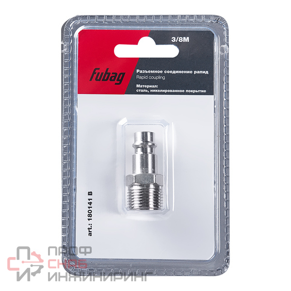 Переходник FUBAG 180141 B применяется для соединения различных частей пневмосистем. С одной стороны фитинг имеет внешнюю резьбу — 3/8", с другой быстросъемное соединение — рапид папа. Созданная конструкция обладает высокой надежностью и герметичностью. Поставляется в блистере.