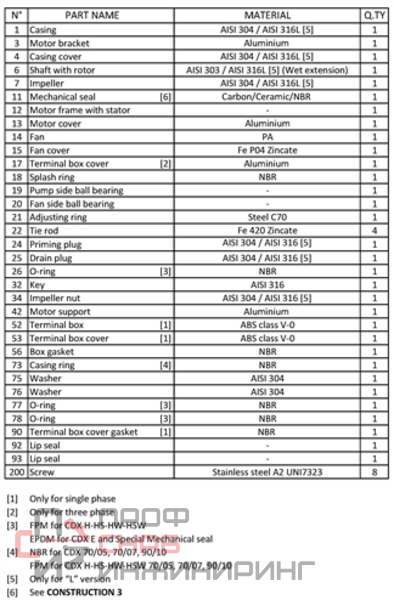 Центробежный насос с одиночным радиальным рабочим колесом, гидравлическая часть которого выполнена из нержавеющей стали AISI 304 или AISI 316, в том числе холодной штамповкой водой с давлением до 1200 бар (модель L), что обеспечивает высокий уровень прочности и надежности при низких гидравлических потерях.