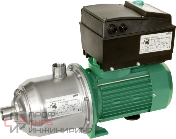 Нормальновсасывающий многоступенчатый горизонтальный высоконапорный центробежный насос блочного типа с горизонтальным всасывающим и вертикальным напорным патрубком, а также со встроенным частотным преобразователем с воздушным охлаждением. Встроенный частотный преобразователь позволяет варьировать частоту вращения, регулировать давление и ПИД-регулятор.