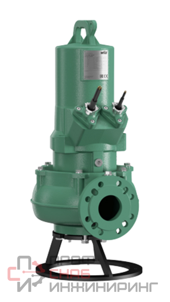 Полностью затапливаемый погружной насос для отвода сточных вод для вертикальной установки в погруженном состоянии и перекачивания фекальных, коммунальных и промышленных сточных вод. Агрегат полностью выполнен из серого чугуна, уплотнение со стороны насоса выполнено из карбида кремния (SiC/SiC), а со стороны электродвигателя установлено манжетное уплотнение вала или торцовое уплотнение. Подсоединение к напорному патрубку с горизонтальным напорным патрубком и фланцевым подсоединением. Трехфазный двигатель с поверхностным охлаждением во взрывозащищенном исполнении, датчиком контроля температуры обмотки электродвигателя и с камерами уплотнений и утечек. Камера утечек контролируется поплавковым выключателем. Камеру уплотнений можно дополнительно контролировать с помощью внешнего стержневого электрода. Продольно герметичный кабель электропитания со свободным концом.
