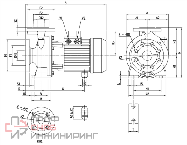Стандартный чугунный насос с рабочим колесом из стали AISI 304 и AISI 316, осевым входом и радиальным выходом, 2- или 4-полюсными двигателями. Предусмотрена возможность снятия двигателя с муфтой, консольной опорой и рабочим колесом без отсоединения всего насоса от трубопровода. Тип торцового уплотнения выбирается с учетом перекачиваемой жидкости, рабочей температуры или иных факторов.