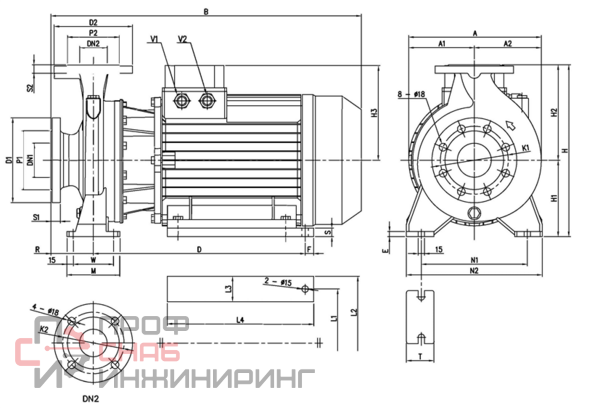 Стандартный чугунный насос с рабочим колесом из стали AISI 304 и AISI 316, осевым входом и радиальным выходом, 2- или 4-полюсными двигателями. Предусмотрена возможность снятия двигателя с муфтой, консольной опорой и рабочим колесом без отсоединения всего насоса от трубопровода. Тип торцового уплотнения выбирается с учетом перекачиваемой жидкости, рабочей температуры или иных факторов.