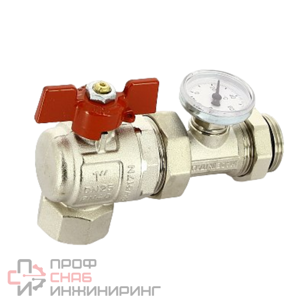 Кран угловой полнопроходной бабочка HB 1" Uni-Fitt с разъемным соединением и термометром для коллекторных групп предназначен для установки на распределительные коллекторы. Установленный термометр позволяет контролировать температуру теплоносителя в отопительных системах и не только. Используется для быстрого и многократного перекрытия потока на трубопроводах отопления. Относится к запорной арматуре и не предназначен для регулирования потока. Для перекрытия и открытия потока используется ручка-бабочка из алюминия. Устройство выполняется из никелированной латуни, максимальная рабочая температура – до 120 оС, минимальная температура – -20 оС. Максимальное рабочее давление – до 30 бар. Термометр определяет температуру теплоносителя от 0 до +80 оС.
