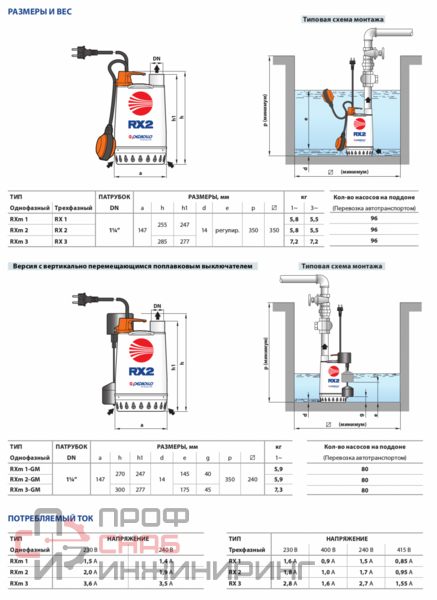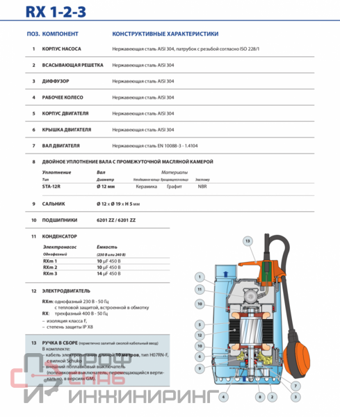Насосы RX подходят для дренажа загрязненной воды, химически неагрессивной по отношению к конструкционным материалам насоса. Применённые конструктивные решения обеспечивают простоту в эксплуатации и безопасность функционирования насоса, благодаря полному охлаждению двигателя и двойному механическому уплотнению вала.