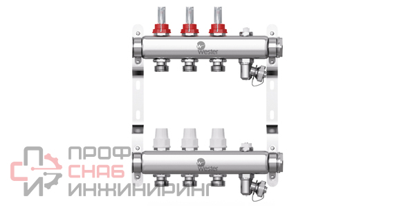 Коллектор Wester из нержавеющей стали с регулирующими и запорными клапанами, предназначен для оптимизации и контроля распределения теплоносителя в системах радиаторного отопления и подогрева пола. Укомплектован кронштейнами для крепления в распределительном шкафу или на стене, переходниками, воздухоотводчиками для удаления кислорода и дренажными кранами для операций заполнения/слива системы. Присоединение 3/4" под "евроконус". На каждой отходящей линии распределителя установлен регулировочный клапан. На каждой входящей линии распределителя обратки установлен запорный клапан.