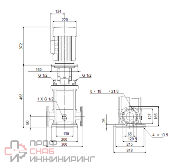 Вертикальный многоступенчатый центробежный насос с одинаковым уровнем расположения портов всасывания и нагнетания. Насосная часть и плита-основание сделаны из чугуна, остальные проточные части - из нержавеющей стали (EN 1.4301)