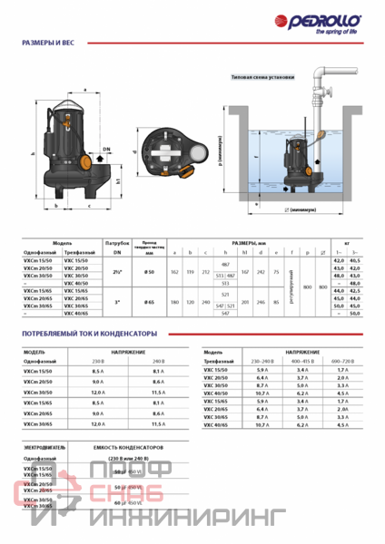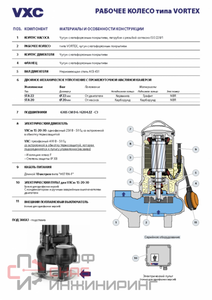 Погружные электронасосы серии VXC изготовлены из чугуна значительной толщины, высокопрочного и устойчивого к абразивному воздействию. Они оснащены рабочим колесом типа VORTEX. Эти насосы предназначены для откачивания сточных вод, содержащих твердые частицы во взвешенном состоянии, нечистот, стоков с отходами и смеси воды с илом.