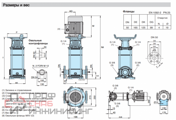Многорядные вертикальные многоступенчатые насосы Calpeda MXV с всасывающими и подающими раструбами имеют одинаковый диаметр и расположены на одном валу (многорядное исполнение). Насос Calpeda MXV укомплектован упорным подшипником, а также соединением с втулкой для использования любого стандартного двигателя модели V1. Как правило, направляющие втулки смазываются перекачиваемой жидкостью и устойчивы к коррозии.