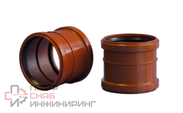Муфта двухраструбная применяется для соединения безраструбовых концов труб в системах наружной канализации. Широко используется в ремонтных работах. Имеет перемычку на внутренней поверхности. В качестве уплотнителей используются резиновые кольца манжетного типа. Муфты двухраструбные пластиковые для наружной канализации выпускаются диаметром 110, 160 и 200 мм. Длина муфты от 105 до 198 мм (в зависимости от диаметра). Материал муфты - полипропилен. Муфта применяется при максимальной температуре перекачиваемой воды 70ºС (кратковременная - 95ºС).