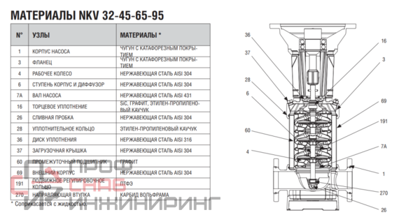 Вертикальные многоступенчатые центробежные насосы предназначены для систем водоснабжения и повышения давления,питания котлов и циркуляции горячей воды в системах отопления, перекачки конденсата и систем охлаждения, пожаротушения и промывочных систем, сельскохозяйственного полива.Корпус насоса и фланец – чугун с катафорезным покрытием;рабочие колеса, диффузоры, крышки диффузоров и корпусгидравлической части – нержавеющая сталь AISI 304. Корпуснасоса с присоединительными фланцами и опора двигателя – чугун с катафорезным покрытием. Стандартизированноеторцевое уплотнение - карбид кремния/ графит / EPDM. Валыдвигателя и гидравлики соединены жесткой муфтой.
