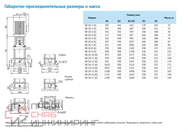 Насосы серии SB (K) - несамовсасывающие вертикальные многоступенчатые насосы инлайн конструкции с фланцевым или Victaulic присоединением с всасывающим и нагнетательным патрубком равного размера. Многоступенчатая конструкция с рабочими колесами, камерами и кожухом из нержавеющей стали. Вал насоса, вал электродвигателя по стандарту LEC соединены напрямую через муфту. Для облегчения эксплуатации все насосы оснащены торцевым уплотнением картриджного типа. Модельные ряды насосов SB (K) и SBI (K) включают в себя различные типоразмеры насосов и количество ступеней для достижения требуемого расхода и напора.