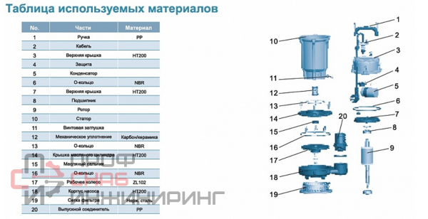 Данный насос является усовершенствованным насосом для откачивания чистых и слегка загрязненных вод. Он рассчитан на долгую, безопасную и эффективную работу. Нержавеющая сталь, специальный чугун и другие высококачественные материалы, использованные при производстве данного насоса, делают его высоко устойчивым к коррозии и изнашиванию. Расположенное снизу насоса входное отверстие обеспечивает максимально полный дренаж. Насос снабжен поплавковым выключателем, автоматически отключающим насос при отсутствии и автоматически включающим насос при наличии жидкости для перекачивания. Двигатель насоса заполнен пищевым минеральным маслом, защищающим его от перегрева и улучшающим характеристики.