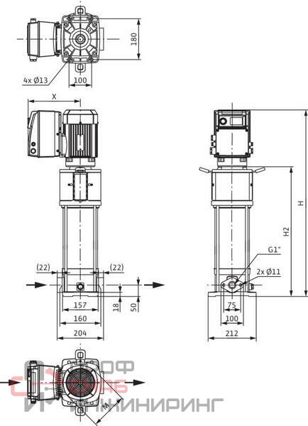 Высокоэффективный высоконапорный центробежный насос вертикального исполнения с линейными подсоединениями, электродвигатель IEC класса эффективности двигателя IE4 с интегрированным частотным преобразователем с воздушным охлаждением. Встроенный частотный преобразователь позволяет варьировать частоту вращения, регулировать давление и ПИД-регулятор.